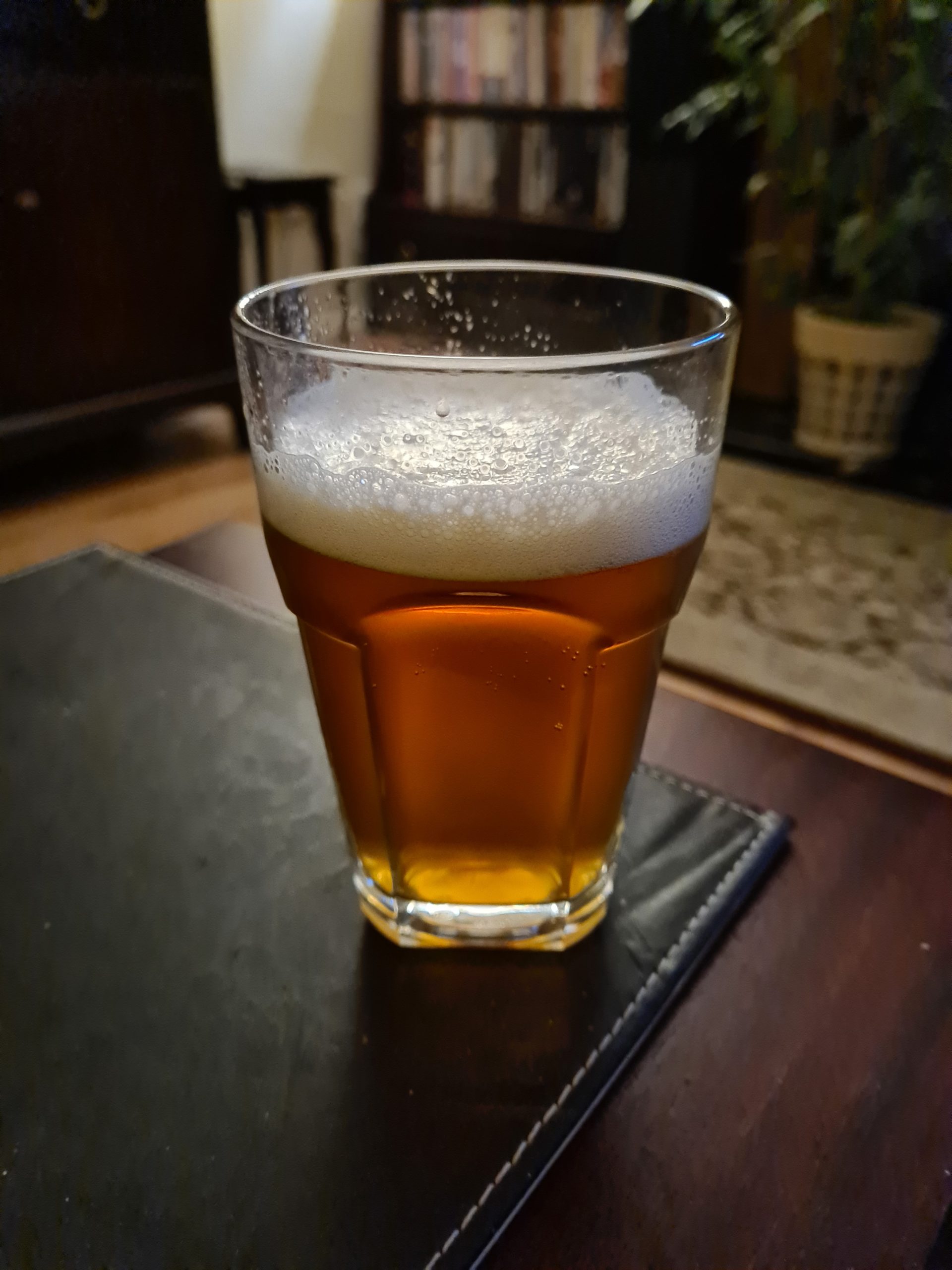 Chinook IPA is an American style IPA using several new world hops. EBC = 10. IBU = 68. ABV = 4%. The primary hop used is Chinook, hence the name. I first brewed this in July 2021. Aroma – fruity hops alongside caramel. Flavour – caramel and toffee on the palate with bursts of tropical fruit. Appearance – not crystal clear (because of the dry hopping), but great head, a result of intense carbonation. Good head retention- see photo. Mouthfeel – spiky bitter finish. |